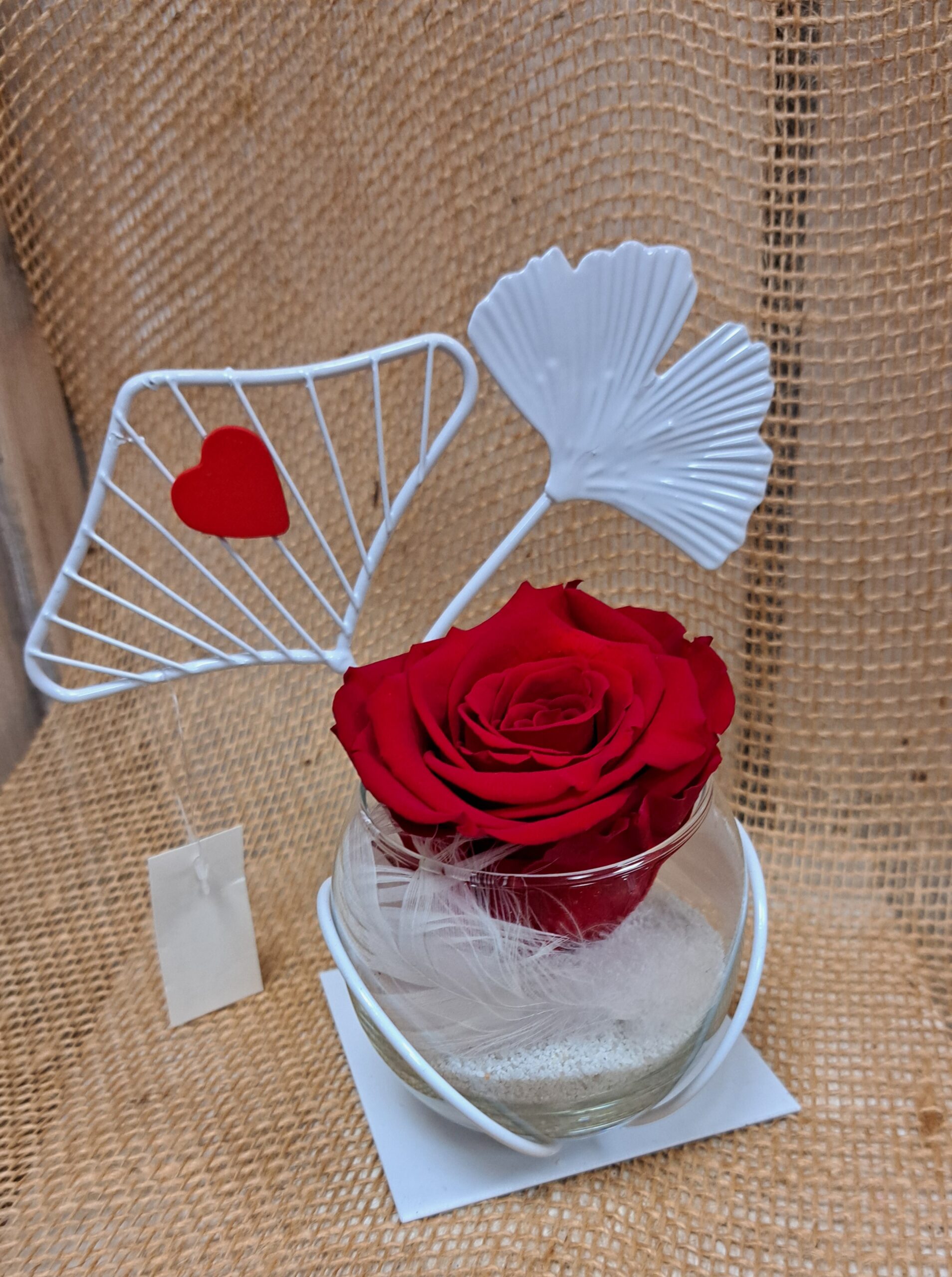 ROSE ROUGE DANS UN SUJET EN METAL BLANC ET UNE BOULE EN VERRE