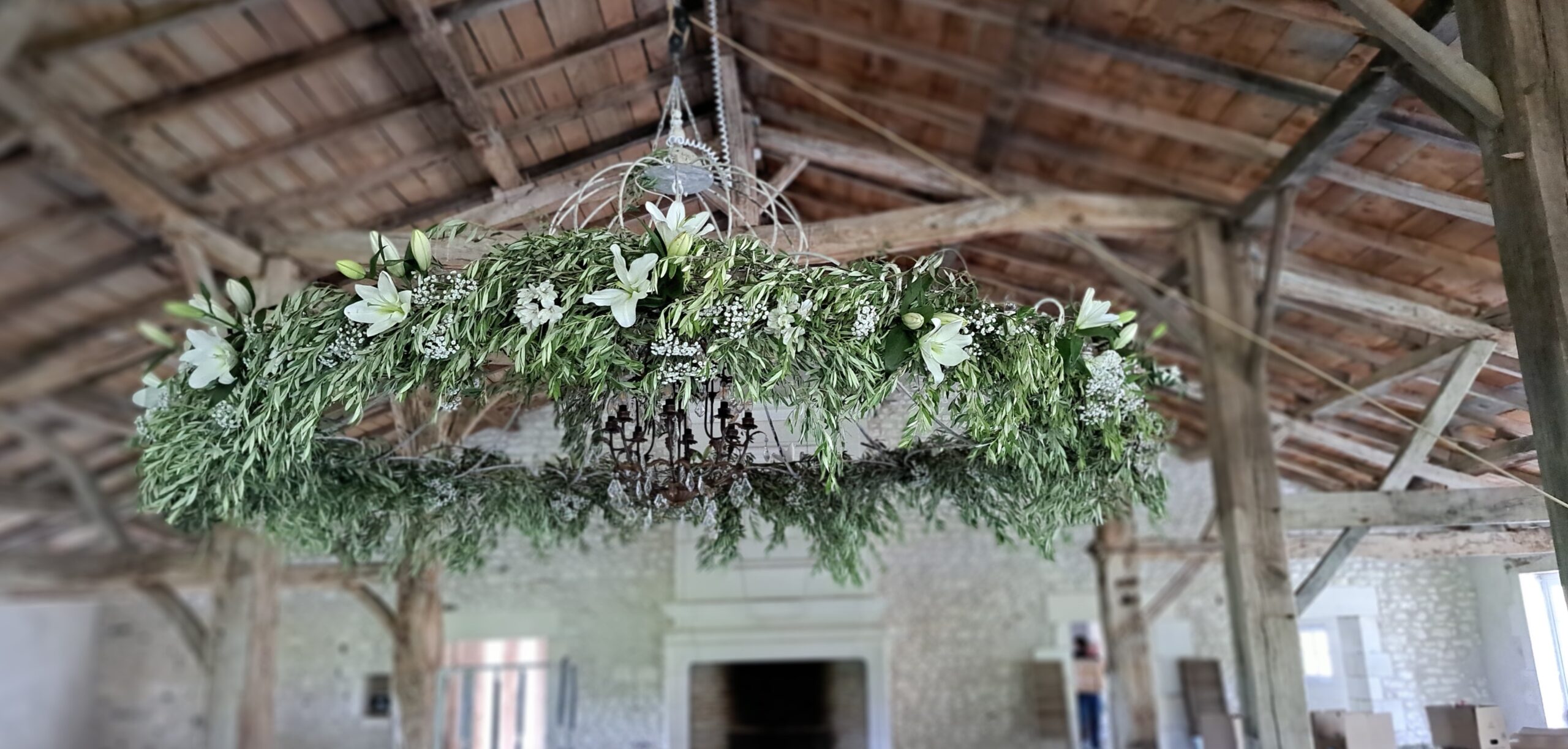 -DECORATION DE LUSTRE AVEC LIS , GYPSOPHILLE, ALTROEMERIA ET FEULLAGE