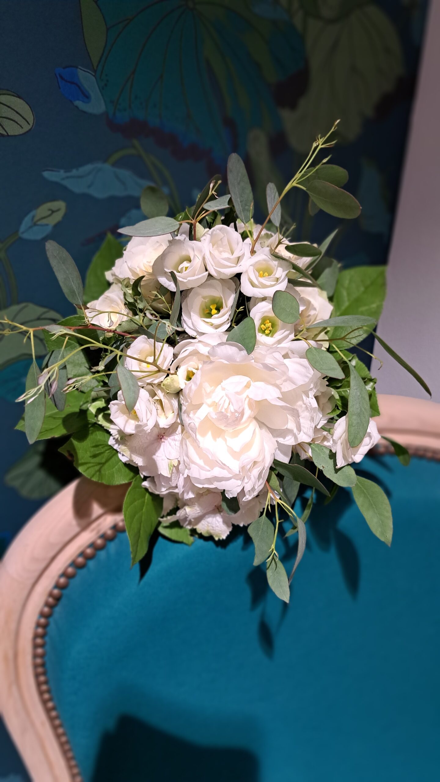 TON BLANC PIVOINE, HORTENSIAS, ROSE, LISIANTHUS, EUCALYPTUS…..