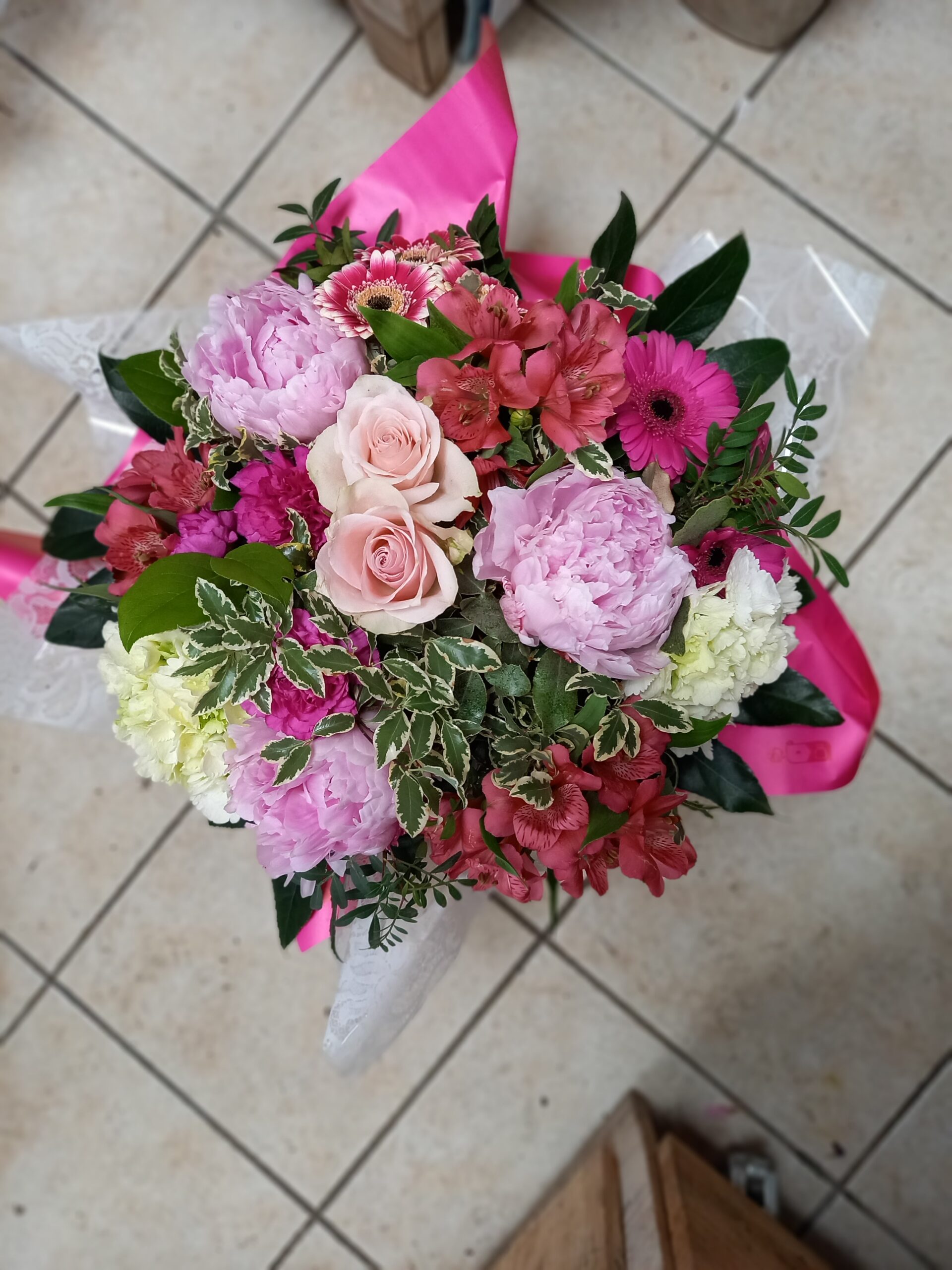 BOUQUET ROND TON ROSE AVEC DES PIVOINES