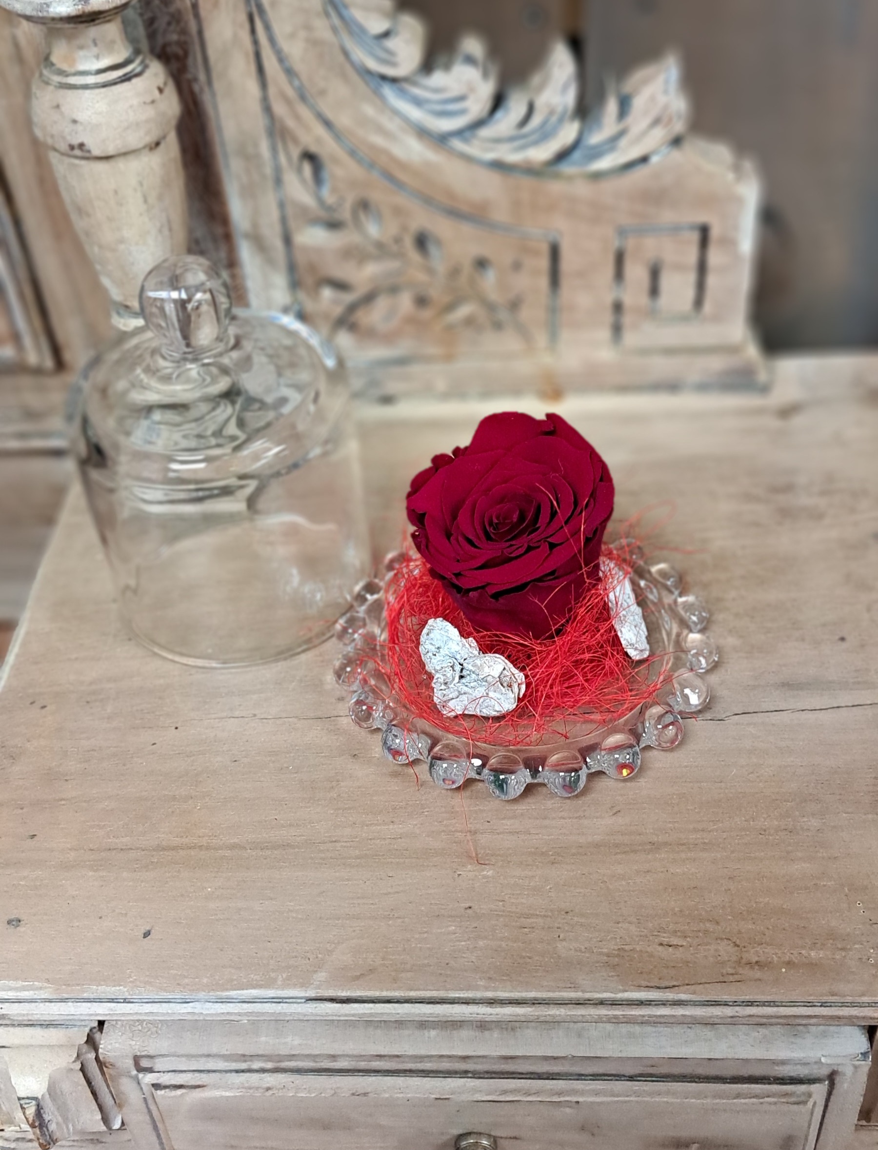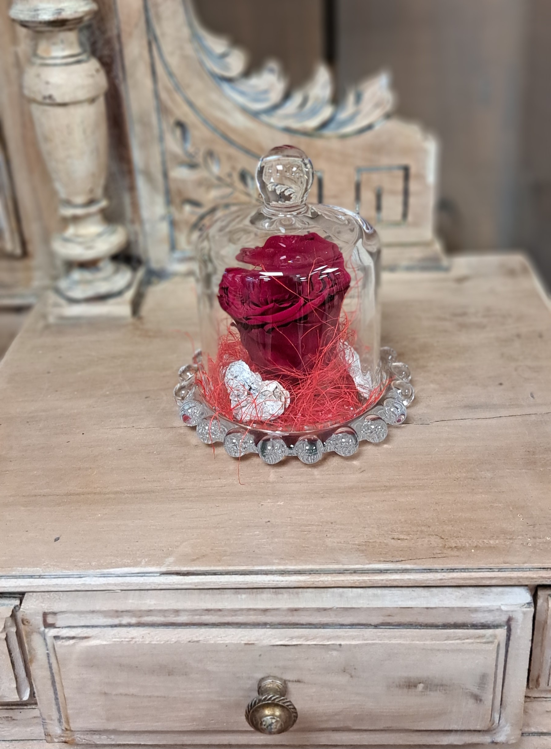 ROSE STABILISEE AVEC UN SUJET EN VERRE EN FORME DE CLOCHE