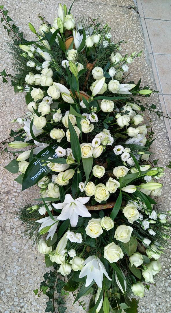 Dessus de cercueil composition de fleurs blanches avec des roses