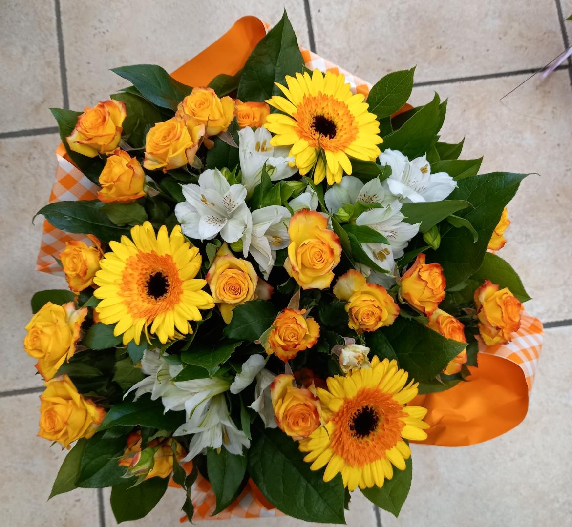 BOUQUET DANS LES TONS JAUNES ET BLANCD ET ORANGERS