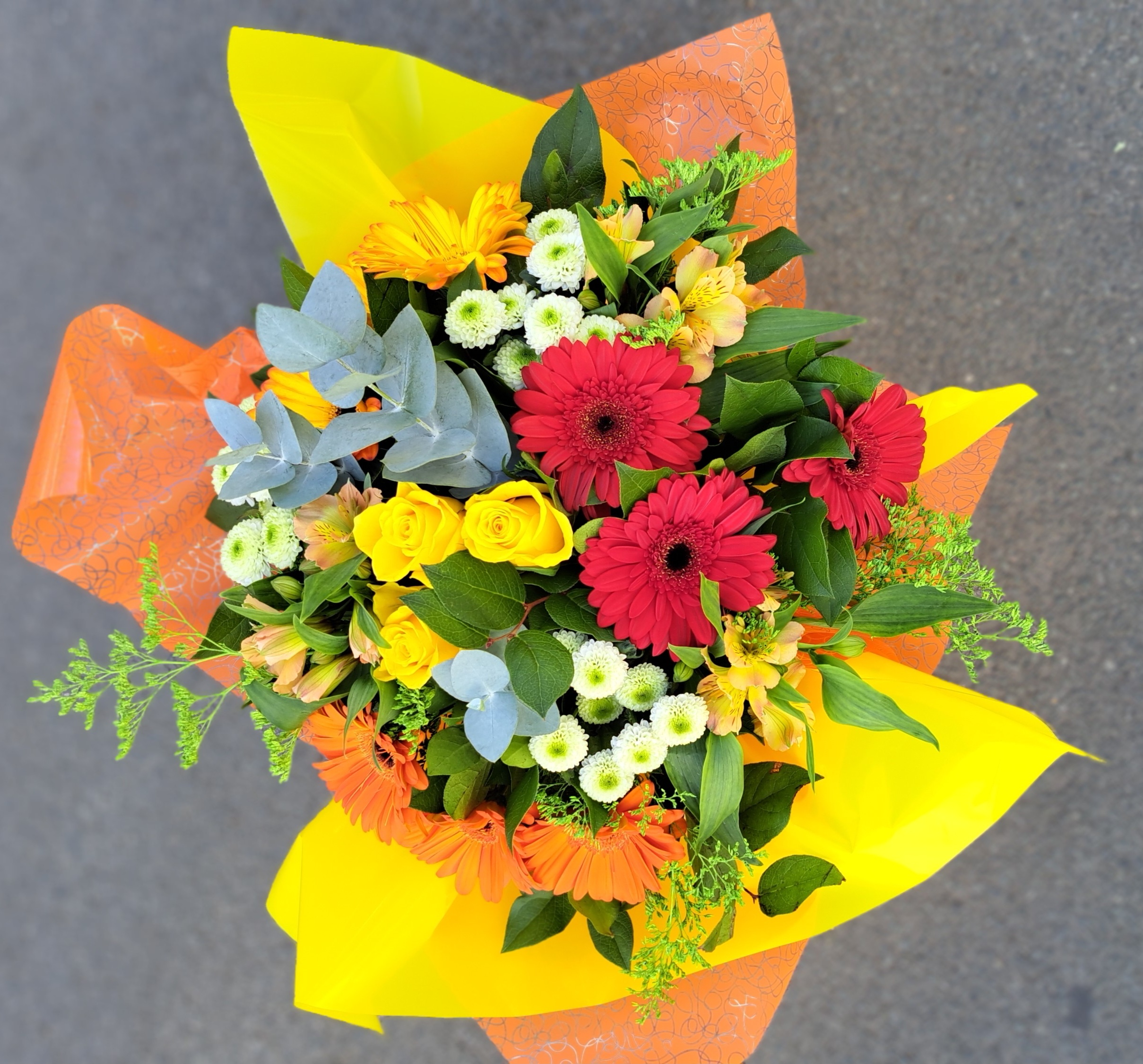 BOUQUET ROND TON ROUGE , JAUNE ET PETIT PEU DE BLANC